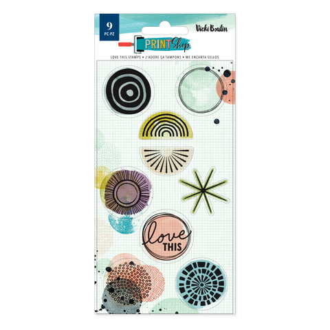 From Vicki Boutin's Printshop collection, one package with 9 clear acrylic stamps. The textures in this collection mimic patterns made with printmaking and stamping techniques. Florals, greenery, and paper pieced icons with a mix of black and white images and large titles compliment the collection.