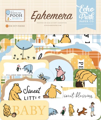 This Ephemera pack includes 34 individually die cut cardstock pieces that feature elements and designs that coordinate with the Echo Park Winnie the Pooh Baby collection.  Acid and Lignin Free.  Made in the USA.