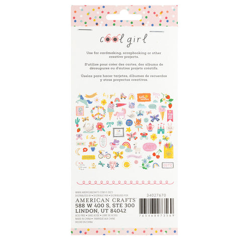 From the Pebbles Cool Girl collection, one package with 74 cardstock and velum (some with gold foil accents) icon ephemera embellishments.  Imported.