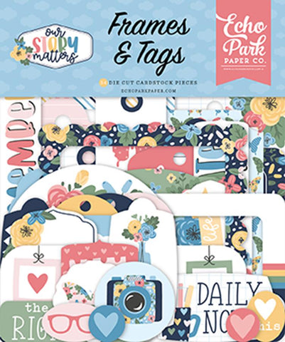 From Echo Park's Our Story Matters collection, one package of cardstock frame and tag embellishments.