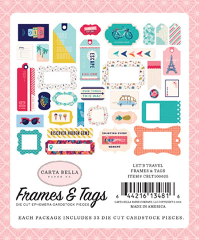 From Carta Bella's Let's Travel collection, one package with 33 cardstock frames and tags. Whether you’re already a world traveler, or you just dream about becoming one, this travel-themed collection is for you! Beautiful designs feature landmarks from all over the world, quirky modes of transportation, and imaginative luggage tags and tickets in a stunning and unique color scheme. A quick exploration of this collection will have you in the mood to scrapbook your photos or record your vacation hopes and dreams!