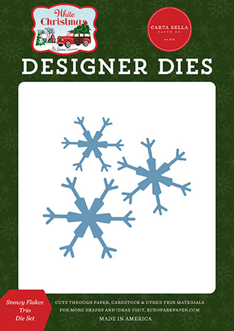 From Carta Bella's White Christmas collection, one Designer Die set cut through paper, cardstock, other thin materials and are compatible with most manual die cut machines. Small snowflake measures 1.3"x1.1". Medium snowflake measures 1.5"x1.6". Large snowflake measures 1.9"x1.7". If you’ve been dreaming of a white Christmas, we’re happy to help make your dreams come true with this collection featuring vintage holiday images, fonts, greetings, and more! You’ll love the traditional symbols of the season presented on the pages and accents in this set – Santa, reindeer, silver bells, and snowy white landscapes are just the start! Trees adorned with colorful lights and ornaments, beautiful snowflakes, candy cane stripes, and cozy plaids will all help ring in the season and make your holiday heart merry and bright! Imported