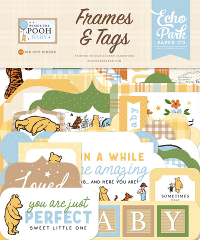 This Frames and Tags pack includes 34 individually die cut cardstock pieces that feature elements and designs that coordinate with the Echo Park Winnie the Pooh Baby collection. Acid and Lignin Free. Made in the USA.