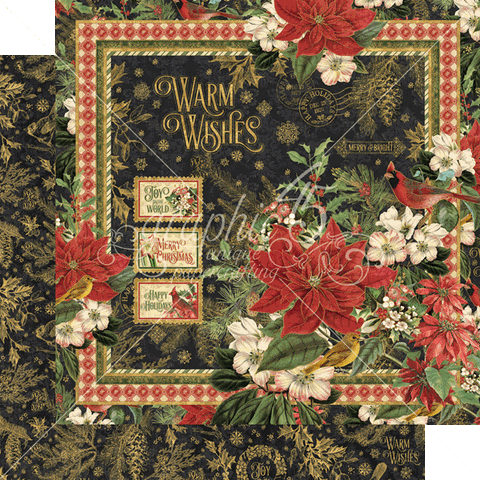 From Graphic 45's Warm Wishes collection, one 12x12 sheet of double-sided patterned paper. This chic holiday collection features a dramatic black backdrop as the perfect compliment to the vibrant evergreens and festive red cardinals and poinsettias. Charming Christmas sentiments make it perfect for all your holiday craft creations.