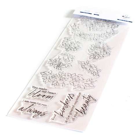 4 x 12 photopolymer clear stamp set designed by Valentine Leclerc. Made to coordinate with the Indigo Roses die, Indigo Roses layering stencils and Indigo Roses washi tape. This innovative stamp includes all the floral clusters on one stamp, so it pairs perfectly with the 1-piece coordinating die. The following sentiments are included in the stamp set: You make my heart bloom, I am here for you always, Your kindness is the greatest expression of your beauty