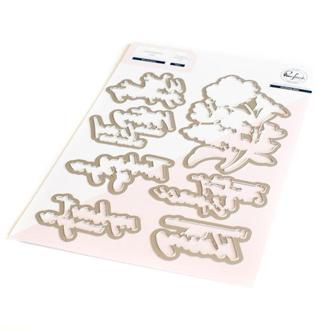 7 pc die set to coordinate with the With Sympathy stamp set, With Sympathy hot foil plate and With Sympathy layering stencil set. This die set cuts around the floral bouquet, leaving a thin border around the image. There are also dies to cut out the 6 main sentiments in the stamp set . Approximate Measurements: Floral bouquet 2 ½” x 4 ¼”